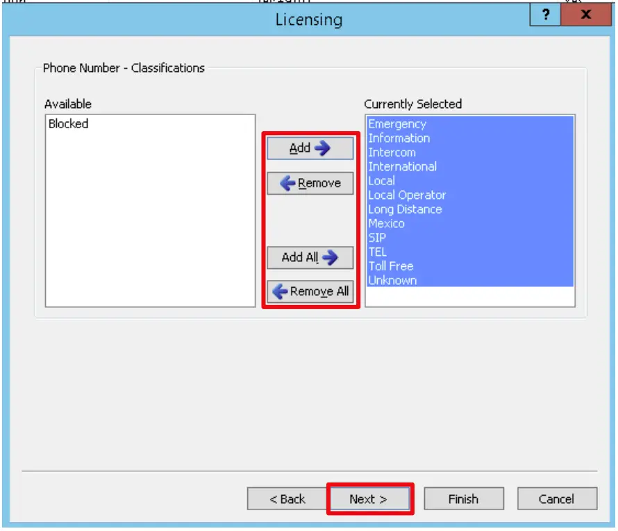 - Add any required Phone Number Classifications to the Currently Selected panel followed by Next.