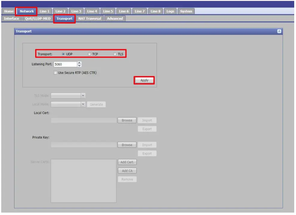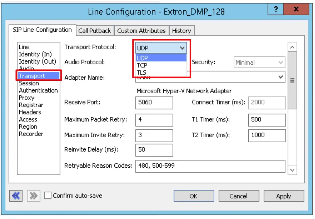 - Set the signaling Transport Protocol as required. The default is UDP.