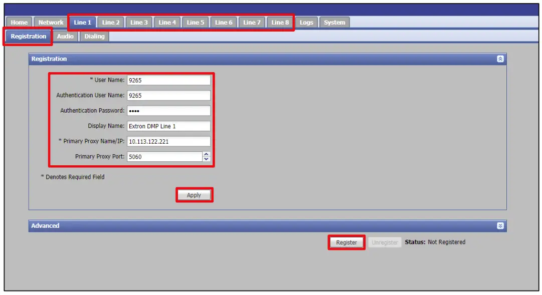 Once the above settings have been entered, click the Apply button to save to the device. Click the Register button to initiate registration to the call server. If successful, the registration status to the right of the Register/Unregister buttons will indicate Registered Primary.
