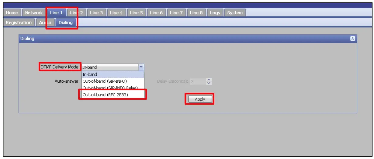 Click Apply after selecting Out of Band RFC 2833 DTMF signaling method for the line. This can be set per line.