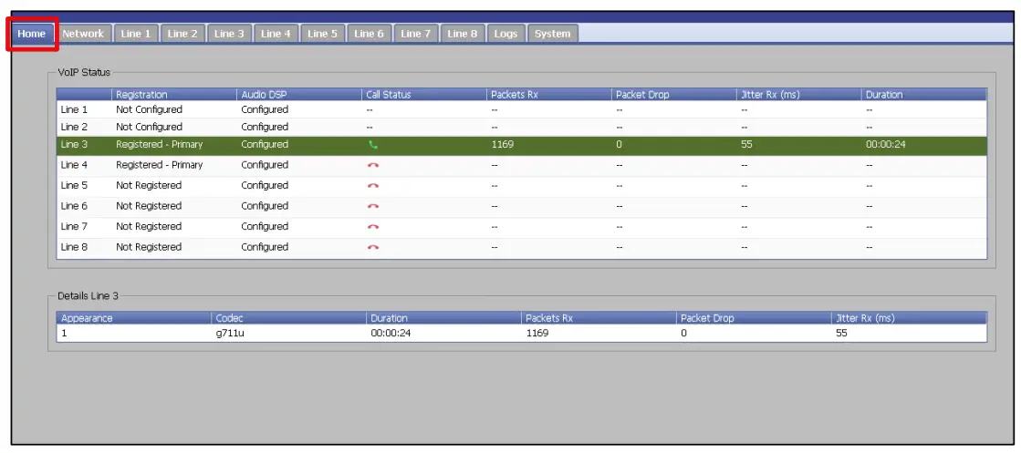 Once all required lines have been registered to the call server, use the Home tab to view a summary of the system, as required. In the example below, one of two registered lines (line 3) is currently in an active call. Appearance-specific (caller-specific) details for active calls can be accessed by clicking on the corresponding Line entry.