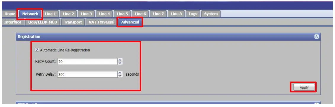 - Enter Retry Count ( 0 99) a. This is the number of attempts a Line will make to re-register i. Example below is set to twenty (20) reconnections attempts ii. If this is set to zero (0), the feature is disabled