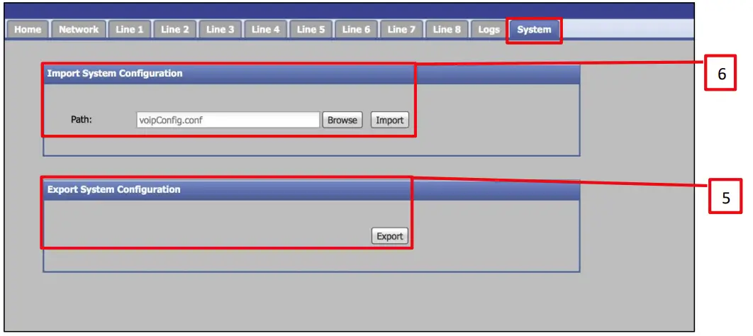 - Under Export System Configuration, click the Export button in order to back up the current VoIP configuration to disk. The file will be saved in the default web browser download directory.