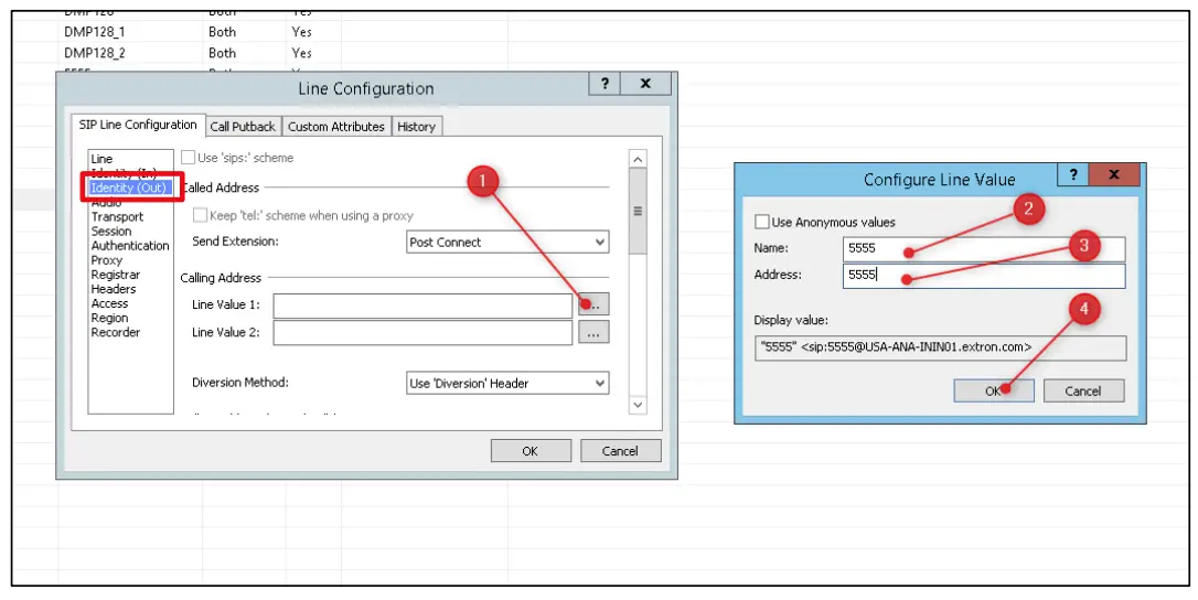 - Click on Identity (OUT) [1] and edit Line Value fields as required [2] and [3]. Click OK [4].