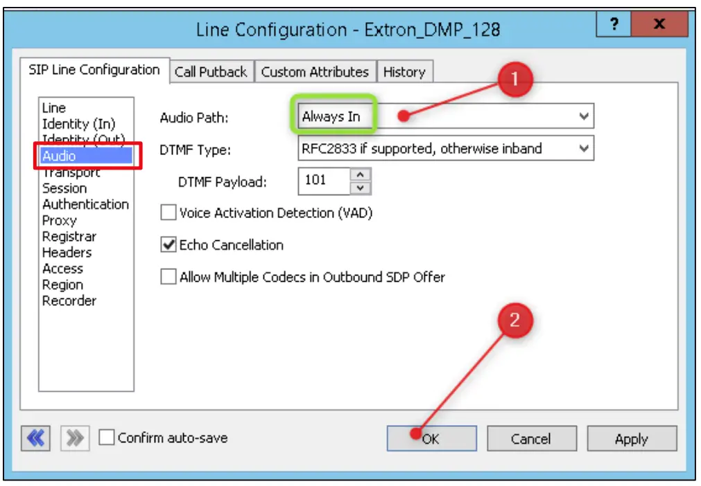 - Click on Audio and edit the fields as shown below [1]. Check the Allow Multiple Codecs box if more than one codec will be assigned to the DMP Plus Series. Click OK [2].
