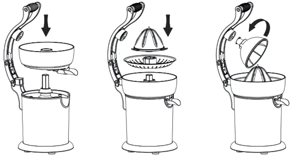 - Insert the fruit dome (3) into to the press handle (2) and turn it anti clockwise to fasten it.