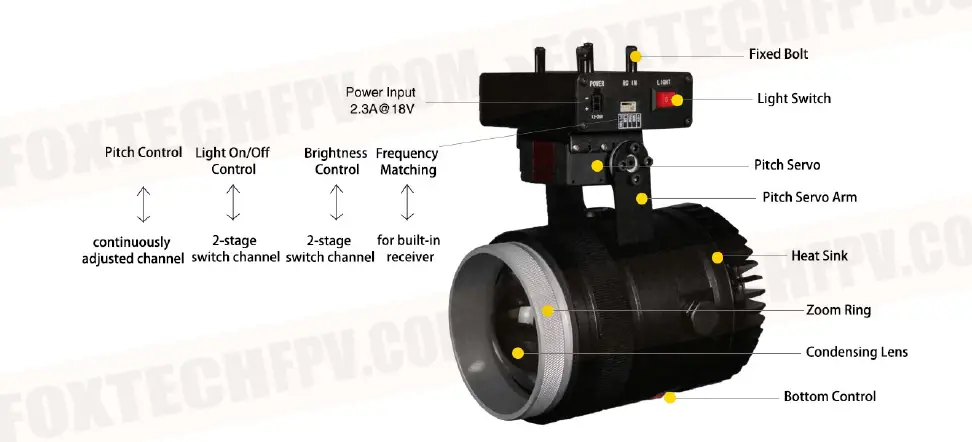 The searchlight supports the remote control channel expansion device of DJI UAV. If the remote control expansion device is used for control, the PITCH control channel value needs to be set as: 1050us↔2075us (down↔up); light on/off, color/brightness control 2-stage switch channel value needs to be set as: 1000us -2000us (median 1500us)