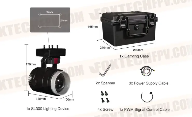 SL300 is a bright, 2-axis stabilized gimbal searchlight, providing excellent illumination effect for operations. It also supports remote control to change light color and brightness and the pitch control can reach up to 90°. The searchlight weighs only 840g and has the power of 45W. 10° two-lens is built-in that emits a sharp beam, and the effective illumination distance is as far as 400 meters. SL300 has a spot diameter up to 15 meters at 100m height and the illuminated area is about 177 square meters. SL300 UAV lighting device can be applied in many fields like night inspection, investigation and evidence collection, direction guide, search and rescue, and other night operations.