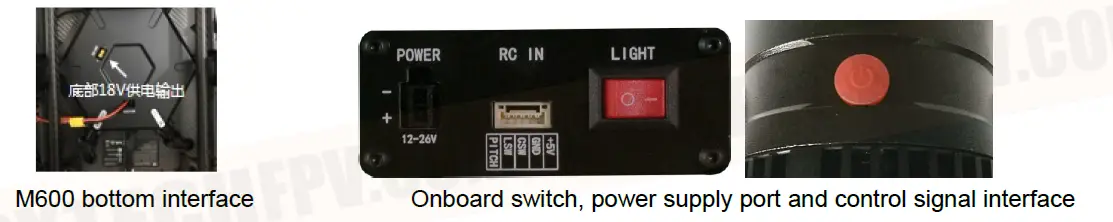 - The searchlight supports wide voltage input. To ensure stable long-term operation, it is recommended to use a 12V~26V DC power supply with an output current greater than 2.5A@18V (power output greater than 45W). For the M600 series drones, there is a 18V DC power output (3.0A current) at the bottom to power the searchlight. If the power interface is already occupied by the front gimbal camera, the user can use the other onboard power interface to power the searchlight.