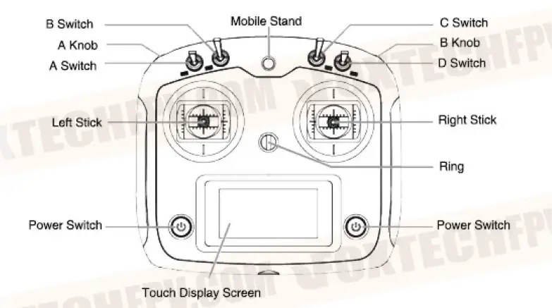 The product supports a variety of remote controller control. To make the description easy to understand and the setting operation more intuitive, the following takes the FLYSKY i6 remote controller(10 channels) as an example to introduce the setting of the SL300 searchlight controlled by an external PWM signal , The setting method of other drone remote controller is similar to this.