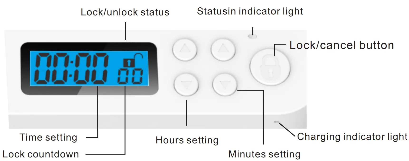 - Double-click lock button and the status light turns red, and meanwhile the 10S countdown starts on display screen, the box will be locked automatically after the countdown ends, (Note: you can click the lock button to cancel/unlock the settings during countdown process)