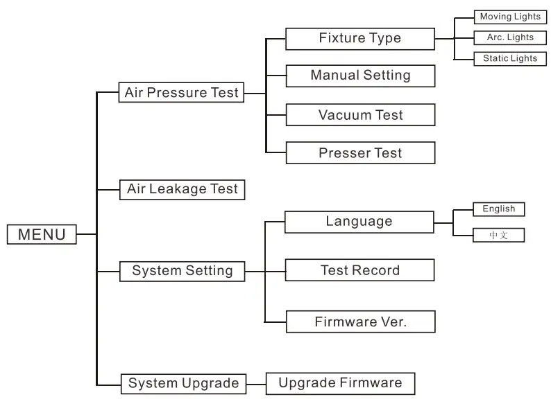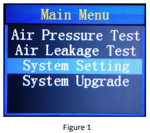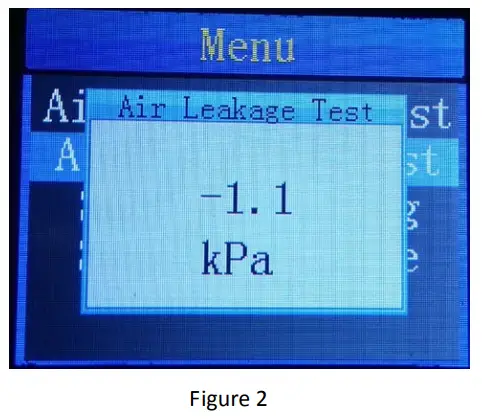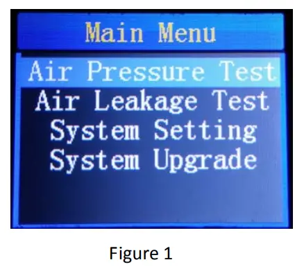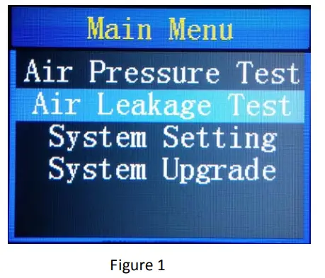 - Enter into the Main Menu and use the UP/DOWN button to select Air Leakage Test (Figure 1), press the ENTER button to confirm, press the MENU button to exit.