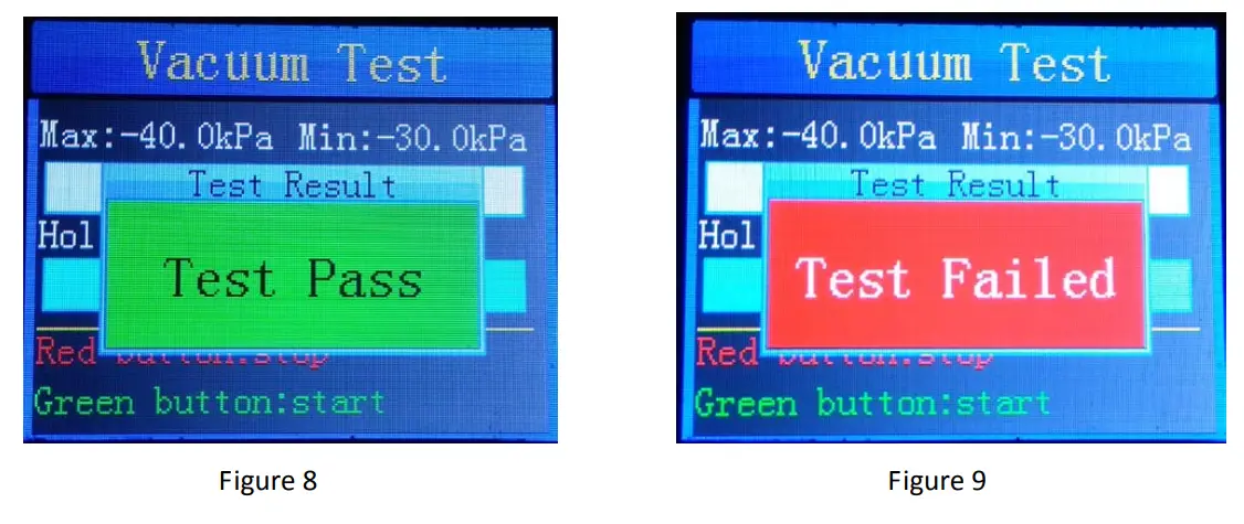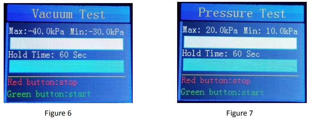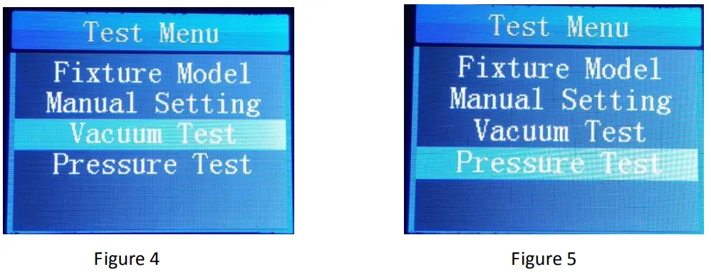- Enter the Test Menu and use the UP/DOWN button to select Vacuum Test (Figure 4) or Pressure Test (Figure 5) as needed, press the ENTER button to confirm, press the MENU button to exit.