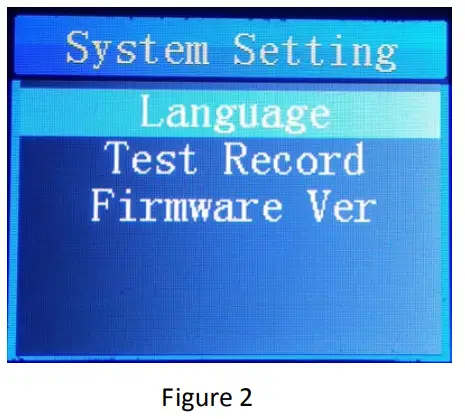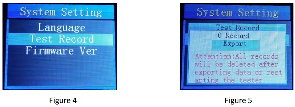 - Enter into the System Setting page and use the UP/DOWN button to select Test Record (Figure 4), press the ENTER button to confirm. Enter into the Test Record page to view and export the test record, press the ENTER button to confirm, press the MENU button to exit.