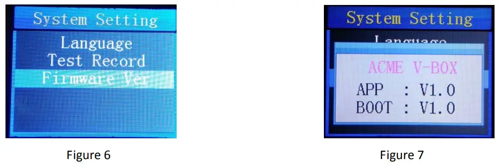 - Enter into the System Setting page and use the UP/DOWN button to select Firmware Ver. (Figure 6), press the ENTER button to confirm. Enter into the ACME V-BOX page to view the firmware version of the fixture (Figure 7), press the ENTER button to confirm, press the MENU button to exit.