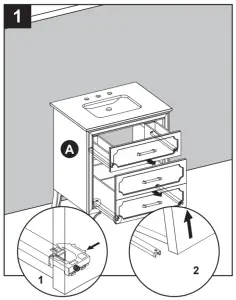 - To remove drawers preassembled in vanity (A), fully extend drawers. Locate plastic levers on metal glide tracks at left and right sides of drawer box. To disengage drawer box from glides, push on plastic levers. Then, gently lift drawer up to remove it from vanity (A).