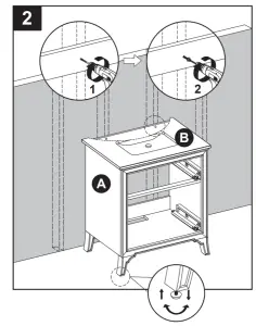 Note: Clean area where the vanity (A) will be permanently located prior to beginning installation, ensuring the vanity (A) will not interfere with any water supply and drain lines once mounted. - With two people, carefully place vanity (A) with Top (B) against the wall in its final location. While holding the vanity base firmly against the wall, use the pre-assembled levelers on the bottom of each leg of the vanity (A) to level the item. Twisting the levelers counterclockwise will raise the height of the vanity (A), and twisting them clockwise will lower the vanity.