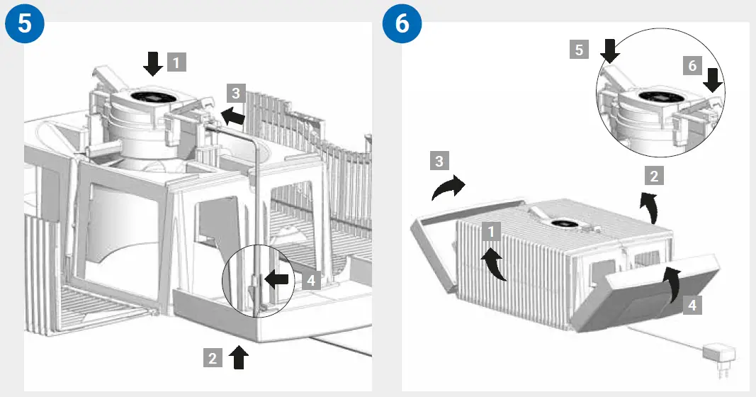 - The outer ends of the locking buttons must be standing up. Fold the ribbed side wings 1 and 2 upwards, then the side elements 3 and 4 . Close the upper housing correctly by pressing down on the outer ends of the locking latches 5 and 6 .