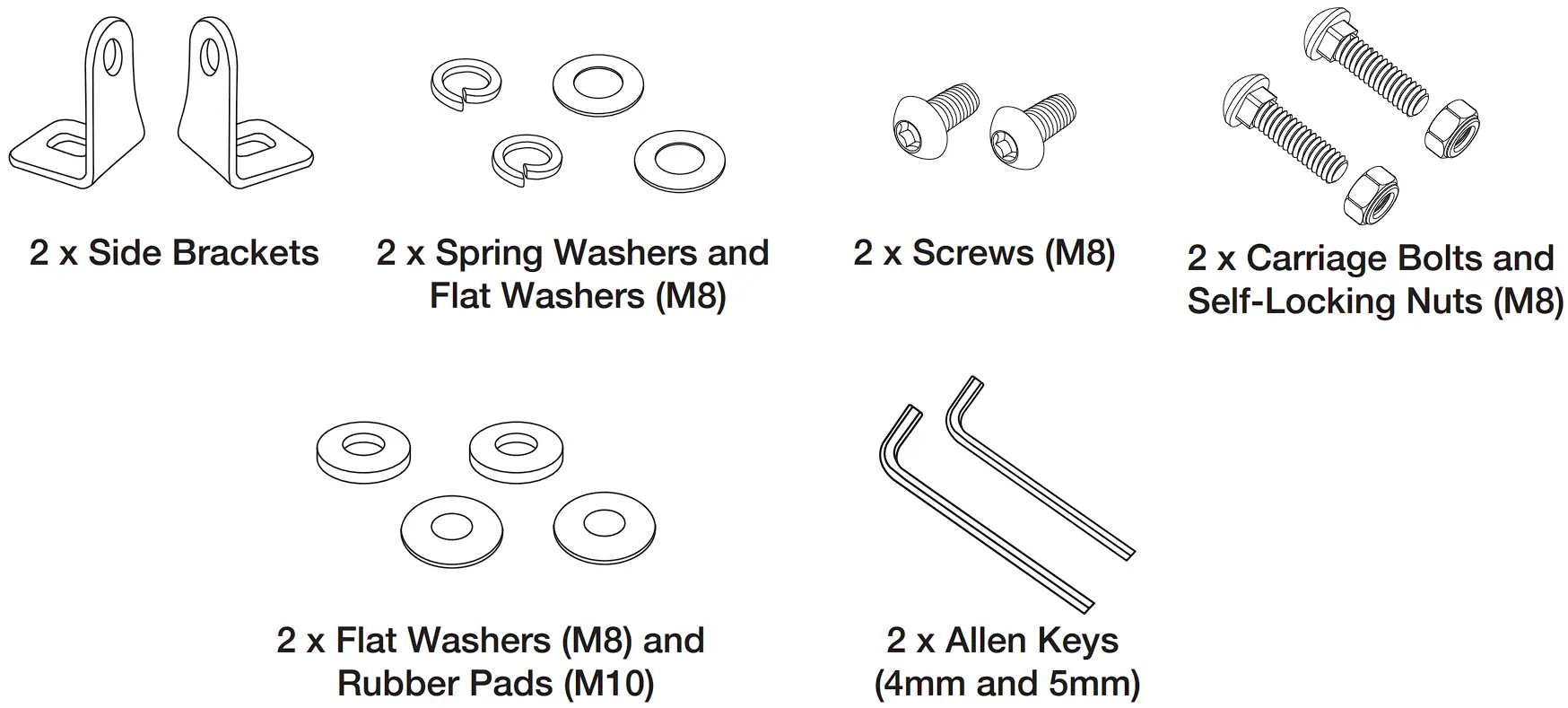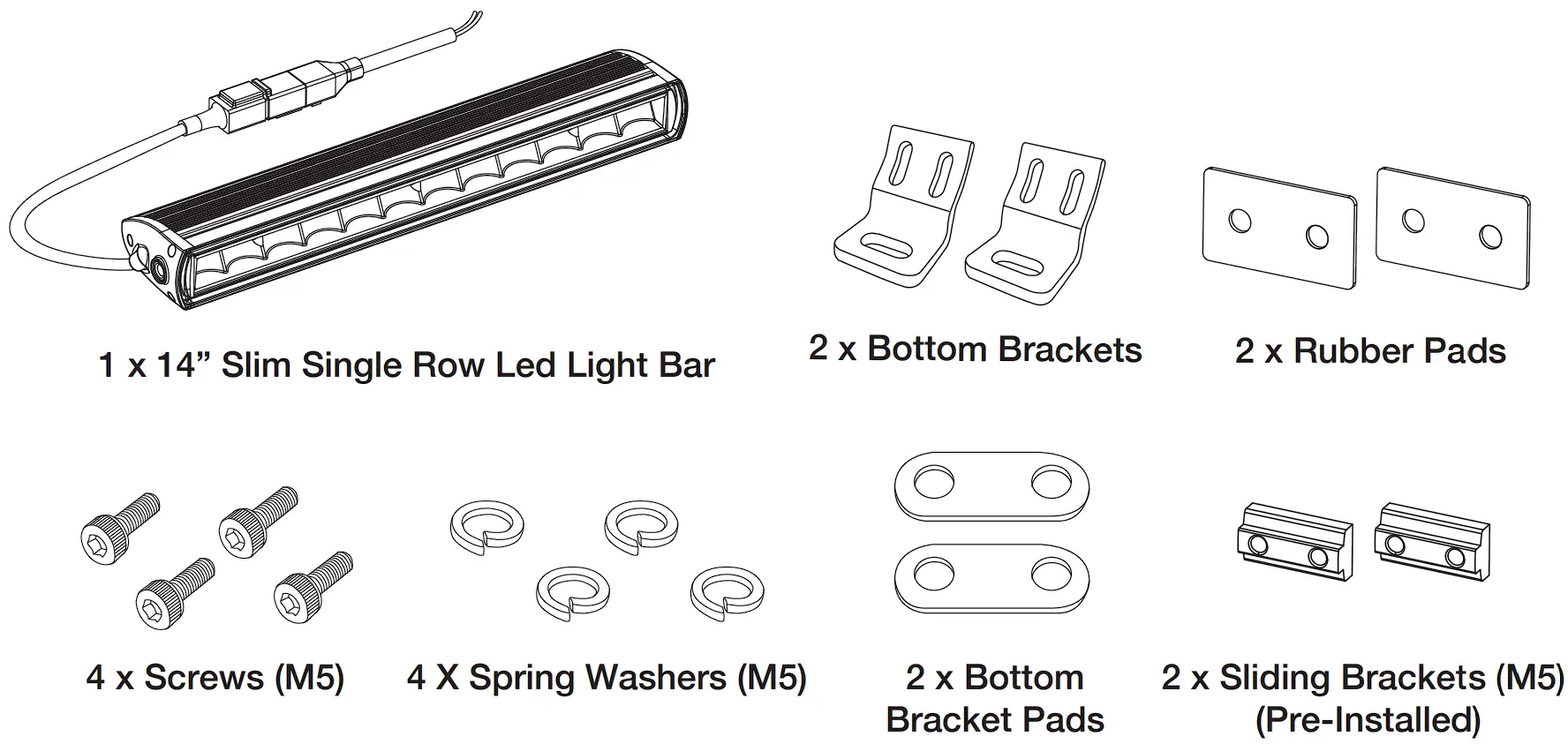 - Option A: Attach the Light Bar to the Bottom Brackets and secure with Rubber Pads, Bottom Bracket Pads, Spring Washers, M5 Screws and tighten with the 4mm Allen Key provided.