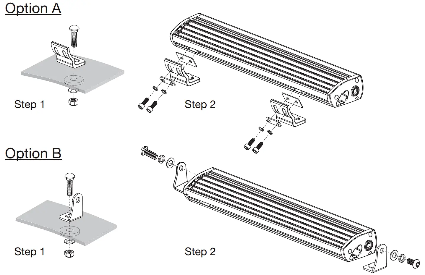 Option B: Attach the Light Bar to the Side Brackets and secure with Spring Washers, Flat Washers, M8 Screws and tighten with the 5mm Allen Key provided. - Adjust the Light Bar’s beam angle by loosening the Screws. Be sure not to over-tighten the screws after the adjustment.
