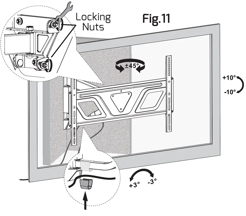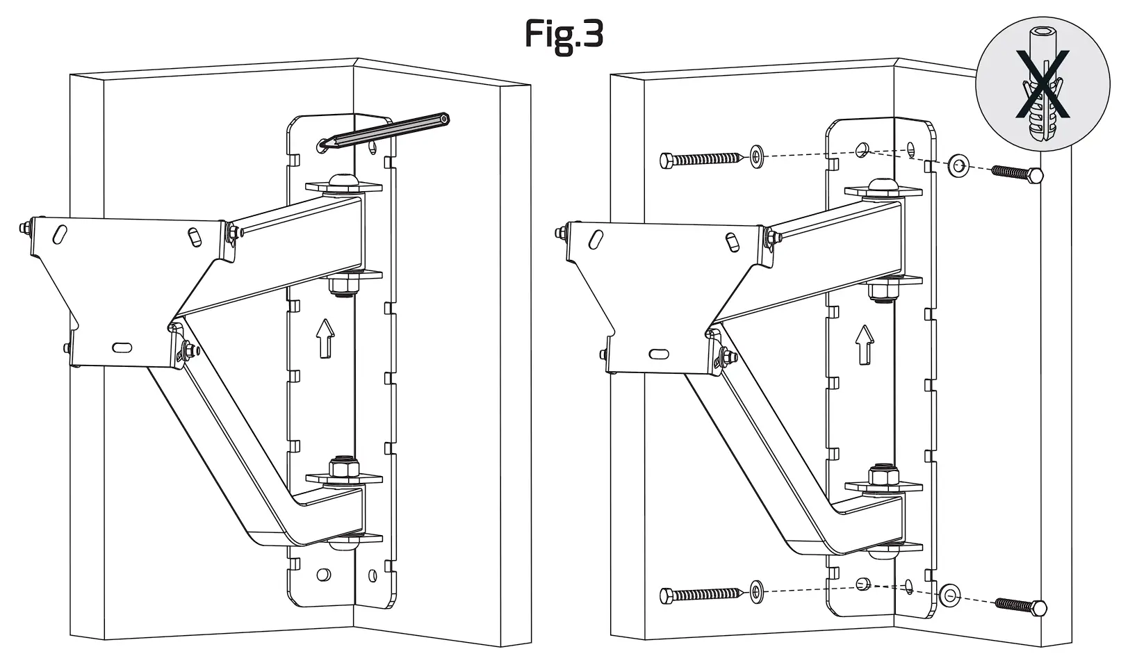 is attached to the wall using four appropriate screws/bolts as shown in Fig.3. Make sure the screws/bolts are suitable for wood and large enough to support the weight of the TV and bracket (if in doubt ask for advice at your local DIV/ hardware store and remember to make sure that the heads of the screws/bolts are the correct size to hold the bracket securely in position).