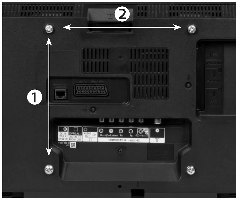 - Measure the distances marked (2) (horizontal) x (1) (vertical) below in mm to find your VESA format.