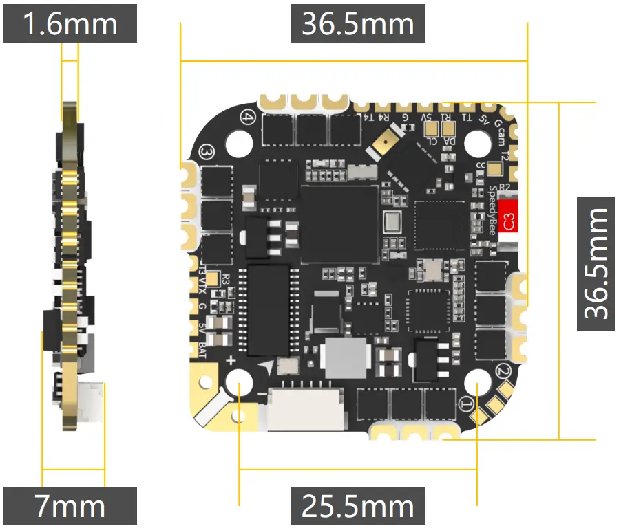 | Dimension | 36.5mm(L) x 36.5mm(W) x 7mm(H), recommended for quads at 3.5″ or above |