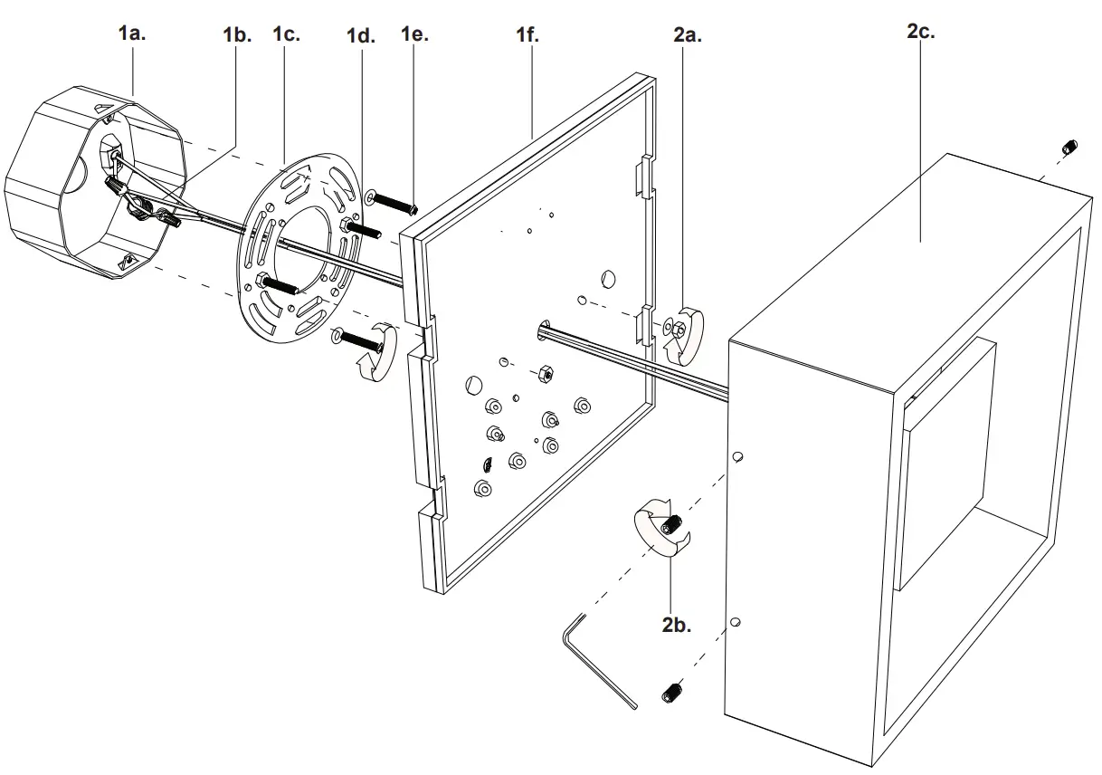 - Align the canopy (1f) to the mounting plate (1c) and screw in the two nuts (2a) provided to secure.