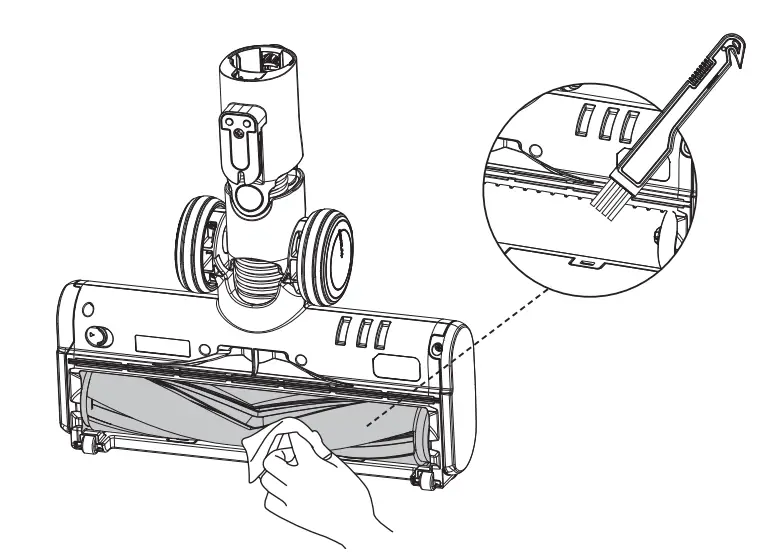 After removing the brush roller, gently clean the brush window, suction mouth and the row of plastic teeth.