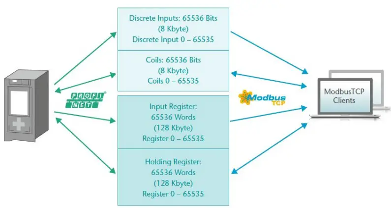The PN/ModbusTCP Coupler is a ModbusTCP server. It receives data via ModbusTCP, which is transferred to the IO image of the PROFINET PLC (inputs in the PLC) and provides data, which it receives from the PROFINET PLC (outputs in the PLC).