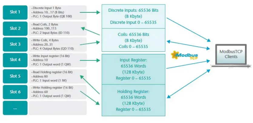 From the point of view of ModbusTCP communication, all coils, inputs and registers are always available in the PN/ModbusTCP coupler. So it is always possible to access all data types from address 0-65535. Via the PROFINET configuration the ModbusTCP data can be assigned to the PLC I/O image in the slots, which are required in the PLC program. Up to 300 slots are available in the PN/ModbusTCP coupler for such assignments.