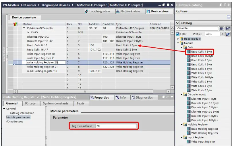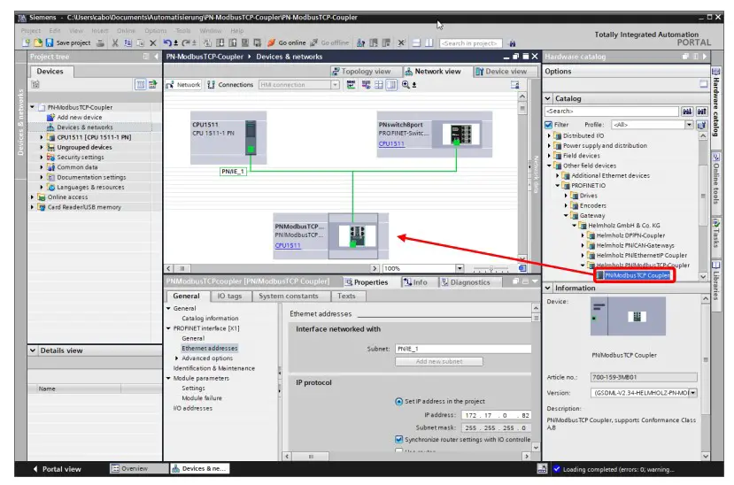 Add the PN/ModbusTCP coupler to the project and connect the coupler to the PROFINET network.