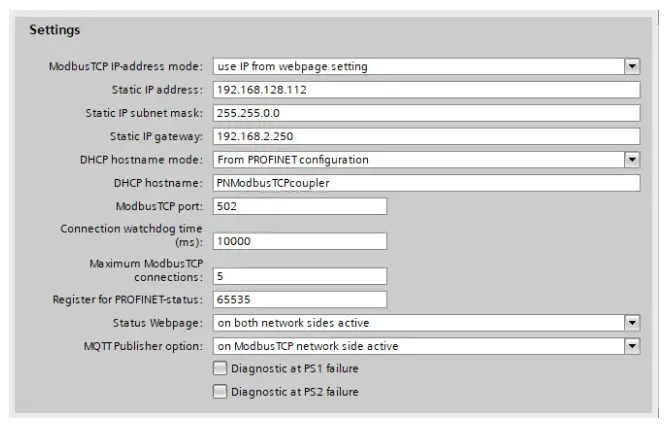 The parameterization of the PN/ModbusTCP Coupler can be done completely via the PROFINET hardware configurator. However, some parameters for the ModbusTCP network (X2) can optionally also be set via the web page, e.g. the IP address of the ModbusTCP server or the DHCP host name.