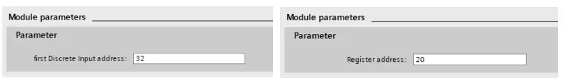All modules have as parameter the register number (Input Register, Holding Register) or the first bit address (Discrete Inputs, Coils).