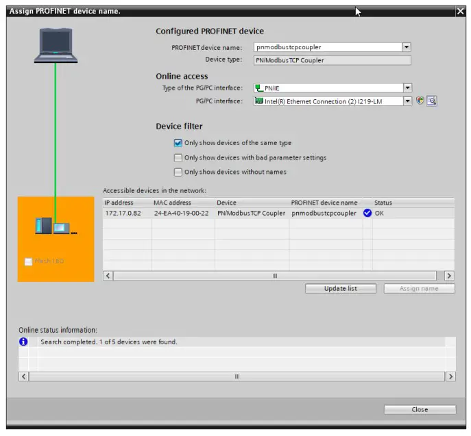 In order that the PN/ModbusTCP Coupler can be found by the PROFINET controller, the PROFINET device name must be assigned to the PN/ModbusTCP Coupler. For this use the function “Assign device name” which you can reach with the right mouse button or in the menu Online if the PN/ModbusTCP Coupler is selected.With the “Update list…” button, the network can be browsed for PROFINET participants. The PROFINET device name can be assigned to the device with “Assign name”.