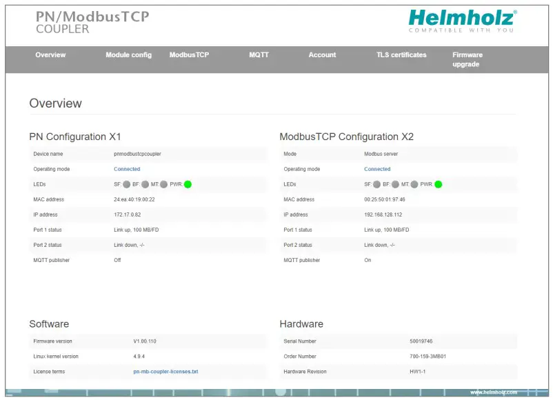 The web interface of the PN/ModbusTCP coupler provides an overview of the status and the configuration of the device, as well as the possibility to perform a firmware update.