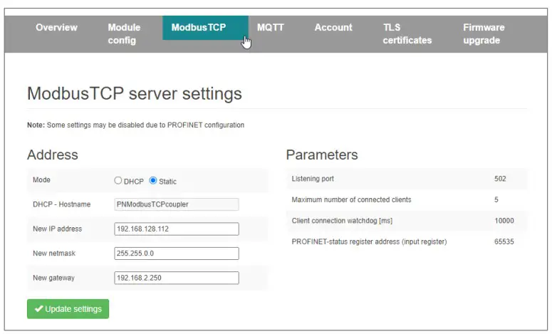 On the web page “ModbusTCP server settings” the IP address and the DNS name of the ModbusTCP network interface can be set, as far as these were not fixed by the GSDML configuration.