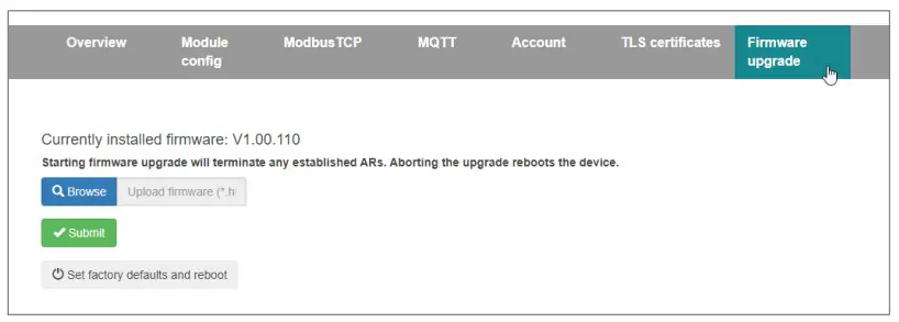 A firmware update can be performed via the web interface on the “Firmware upgrade” page.