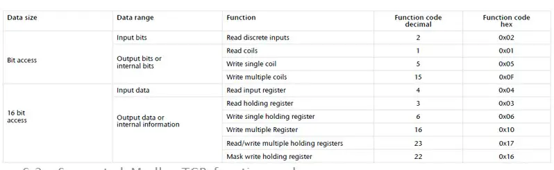 6.2 Supported ModbusTCP function codes