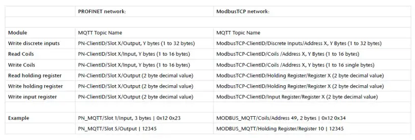 “ClientID/Modules List”: Contains the list of all topics provided by the PN/ModbusTCP coupler via the addressed interface.