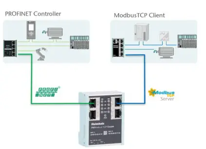 With the PN/ModbusTCP Coupler a simple and uncomplicated connection of a PROFINET network with a ModbusTCP network is possible. The PN/ModbusTCP Coupler allows the data transfer between a PROFINET controller and ModbusTCP stations.