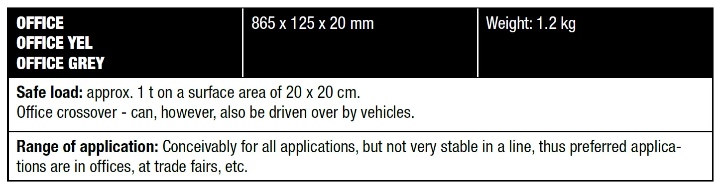 The load-bearing capacity specified in the detailed descriptions is achieved only on level and solid ground. Load-bearing capacity may be greatly reduced on uneven or soft ground. In such cases, you should conduct appropriate load tests before using the protector. We guarantee the load-bearing capacity of our cable protectors only with proper use of unmodified products on firm and level ground.