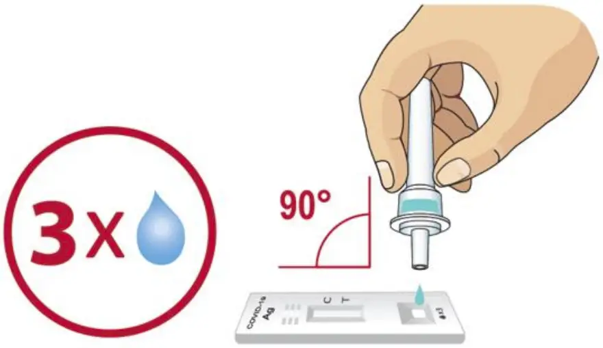 - Invert the extraction vial and ho ld the sa mpl e vert ica lly above the sa mpl e well. Sq ueeze the via l gen tl y. Allow THREE ( 3 ) drops o f sample t o fall int o th e samp le we ll.