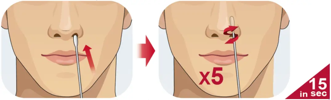 - Gently remove the swab from the LEFT nostril and place directly into the RIGHT nostril, repeating the process of rotating at least 5 times in a circular path for a total of 15 seconds. Remove the swab from the RIGHT nostril. of 15 seconds. Remove the swab from the RIGHT nostril
