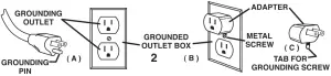 The dryers are for use on a nominal 120-volt circuit, and have a grounded plug that looks like the plug illustrated in Figure A. A temporary adapter that looks like the adapter illustrated in Figure B and C may be used to connect this plug to a 2-pole receptacle as show in Figure B if a properly grounded outlet is not available. The temporary adapter should be used only until a properly grounded outlet (Figure A) can be installed by a qualified electrician. The green colored rigid ear, lug, or the like, extending for the adapter must be connected to a permanent ground such as a properly grounded outlet box cover. Whenever the adapter is used, it must be held in place by a metal screw.