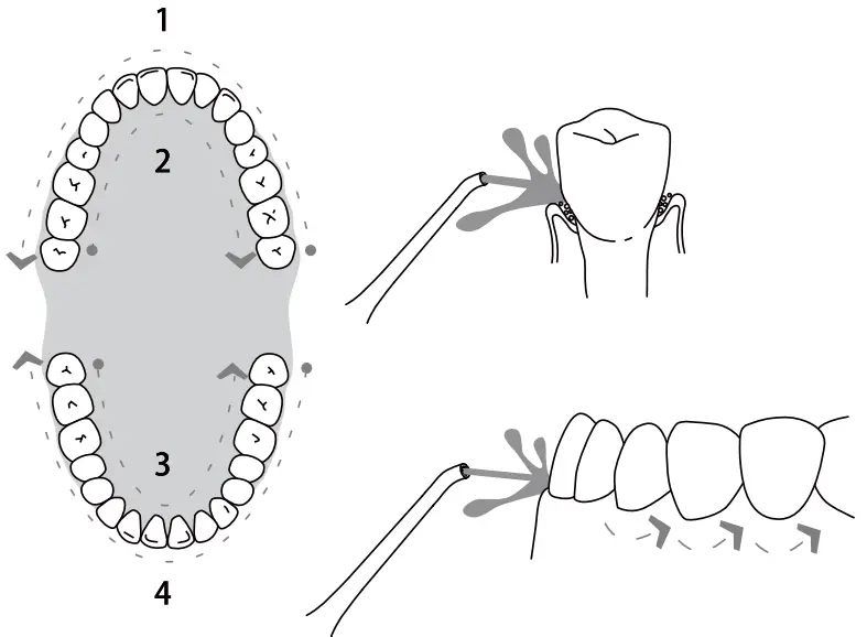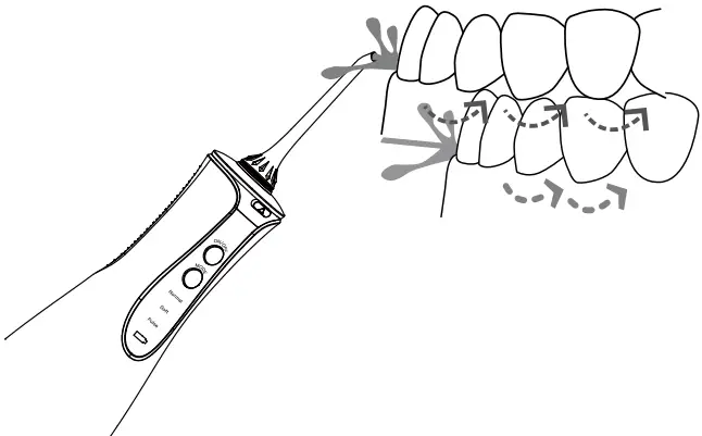 When the water flow and the gums are at a 90 degree angle, slightly close your mouth in order to avoid the water spraying out. In order to achieve the best results. Please start from molar area to the incisors. Slide the water flow along the gums, as well as stay a while between teeth, until the area around the gums and the spaces between the teeth are fully cleaned.