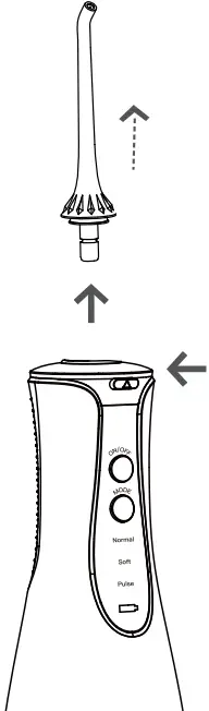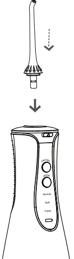 Holding the device at downward, aim the jet tip to the teeth by rotating the tip base before switching on the device.