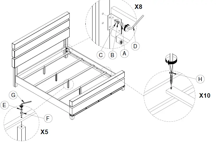 Attach the Slat (4) to the Side Rail (3) with a Screw (H) using a Phillips screwdriver (not provided).