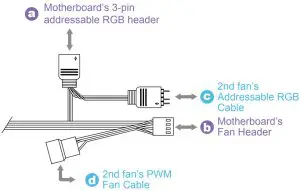 - The PWM Fan Cable, Addressable RGB Cable and their counterparts are attached to each fan.