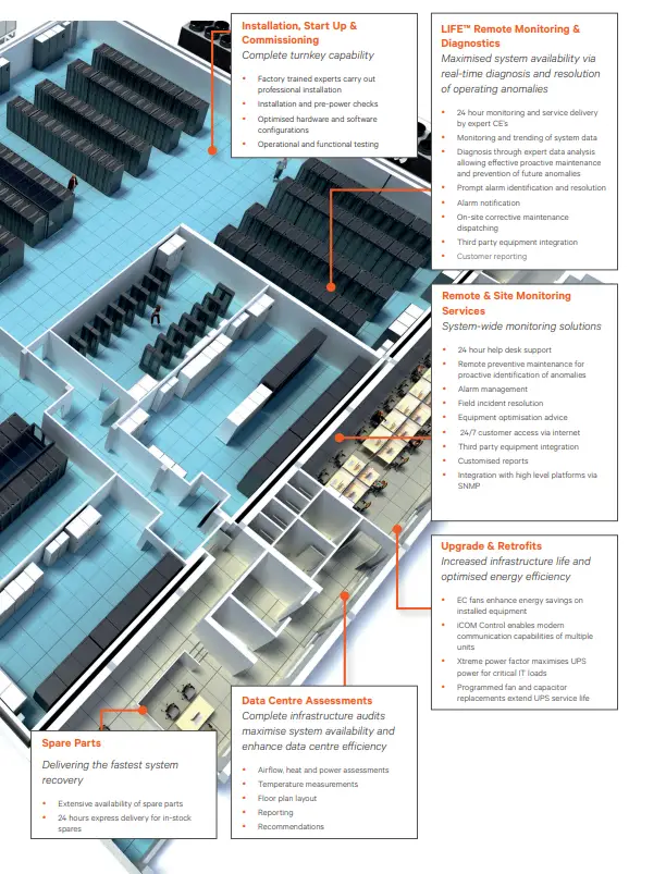 Installation, start-up, commissioning, site assessments, battery maintenance, replacements, upgrades, retrofits, 24/7 emergency service, remote monitoring and diagnostics are just a selection of the services that contribute to guaranteeing business-critical continuity